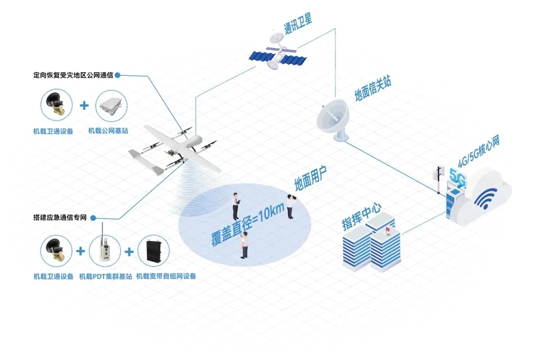 HC-541應急通信復合翼無人機作為中型無人機救援平臺,全機關鍵子系統均采用冗余設計,該機型最大載重30kg、最大航時可達6小時。可搭載光電吊艙、快速三維建模載荷、機載公網基站、機載PDT集群基站、機載寬帶自組網設備、機載衛通設備、機載人員搜救載荷等,廣泛應用于應急救援、偵察航測等場景。