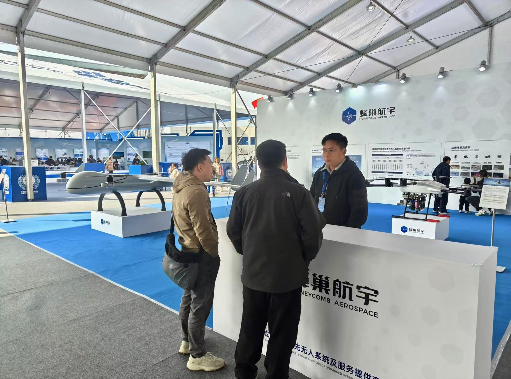 展會期間,多位政府及行業領導專程來到蜂巢航宇展臺,詳細了解企業在低空經濟領域的技術創新成果及行業應用案例。蜂巢航宇工作人員全程陪同講解,重點介紹了兩款備受矚目的產品——HC-541垂直起降固定翼無人機與HC-342油電混合動力六旋翼無人機。