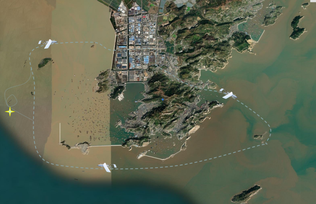 The HC-525 is a dedicated UAV for the SU-50 Intelligent automatic airport. It is not restricted by the take-off and landing site and has a long inspection duration, offering the optimal solution for long-distance zonal application scenarios. Flying along the predetermined route, the average distance between the route and the coastline is 3 kilometers, the total length of the route is approximately 25 kilometers, and the flight lasts for 25 minutes. During the flight, a suspicious vessel was spotted, and there is an unnamed island at the position of the crosshair in the image. The UAV circles around the island for observation and simultaneously calls for the 332H UAV platform.